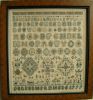 A stunning Friesian sampler with its use of only three colors. Dirkjen stitched four alphabets, each consisting of 19 letters, which is usual for Friesian samplers. The "I" and "J" are interchangeable, as are the "U" and "V". The "Q", "X", "Y" and "Z" weren't often used. She included many geometric motifs typical to samplers from the southwest corner of Friesland, Hindeloopen. The border across the top is another common element to these samplers. Some of the more unusual motifs are the "flap aan de want" ("flap on the wall" or folding table), glasses, children skipping rope, tea being served, and a dog licking from an overturned pot. As in numerous Friesian samplers, there is a delightful scene along the bottom, this one containing a beekeeper on the left, and numerous bees throughout. The original is in the Fries Museum, access no. FM 1957-34. Stitches used are cross, eyelet, stain and back stitch.