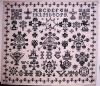 samplers originated in these schools. The majority of the girls were between the ages of 13 and 17. Most of these samplers were framed in an ornate black frame and hung above the door in the parlor. These samplers were all stitched with black silk, possibly because they thought it looked nice but also because black was the fashion color in clothing during this time. Perhaps they didn't have a source for colored silk. It is known that traveling salesmen from Germany carried black silk in their baskets and it was relatively inexpensive. Besides the large format, some of the other similarities in these samplers in the large basket with carnations, tulips, corner motifs, rooster, dove and wreath carried by angels. The letter "G" is often stitched with a crown above it. IBG's