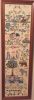 MRT’S gorgeous band sampler is of southern German origin. These long band samplers were made in the Roman Catholic south and were mainly stitched using Italian cross stitch, making them totally reversible. Most of these samplers contain at least one alphabet and several decorative bands, the first of the large floral bands at the bottom is found on several other samplers. The large parrot, the crucifixion and Adam & Eve are the main motifs on this sampler. The large peacock with its