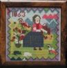 A charming and naive little sampler of a girl with oversized birds in a garden. The entire sampler is filled with cross stitch and is from Winnipeg. Our sampler uses silk floss.