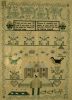 Janet stitched a very typical Scottish sampler with its pansy band, the "S" handled vases with tulips and the house with a fenced yard and path. Another frequent feature to Scottish samplers are the crowns with family initials below them. The house is one of three different styles of houses used on samplers from Scotland. What makes this sampler unique is the coloring, the freehand birds and the sheep and peacocks along the bottom. It seems that she unpicked her age, a more common occurrence, as the young lady didn't want her age to be known. The verse is a well known one, "favour is deceitful and beauty is vain…" Our sampler is a reproduction from the Royal Scottish Museum.