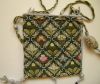 The small bag is worked with double running, tent, plaited braid, Ceylon and spiders wheels using silk and silver and gold.