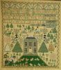 A delightful Scottish sampler made by Elisabeth when she was probably twelve years old. The style of trees are typically found on Scottish samplers as are the peacocks with the seven tail feathers. The cat, bottom left is a nice addition.
