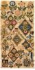 Stitches used are tent, detached buttonhole, spiral trellis, couching, bullion knots, back stitch, French knots and plaited braid. Worked mainly with silk and with silver and gold accents.