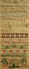 Hepzebak's sampler was made in Boston. The octagonal lozenge shape band is a common band on samplers from here. It uses satin stitch, long armed cross, marking cross, algerian eye, marking cross with a four sided stitch on the back, stem stitch, bullion knots, cross over one thread and free hand embroidery.