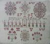 Stitches used in the sampler are cross stitch, eyelet over both four and six threads and back stitch. The original sampler was an a very uneven weave linen and ours is worked on a 35/40 ct. linen and will measure 15†x 12â€.
