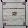 This knottedoek or dowry cloth is an adaptation of ones made in the province of Friesland in the 17th century in the Netherlands. Very few survive today. They were made by a young man's mother or sister to present to his girlfriend when asking for her hand in marriage. It held a number of coins and if the young lady tightened the knot her answer was yes. The verse is from Romeo and Juliet and the center section can be personalized.