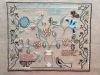 Elizabeth was the sixth of ten children. She completed her first known sampler on or about August 16, 1813, followed by a completed pictorial sampler with drawn work prior to her December birthday in 1813. In this second sampler, wrought in multi-color silk threads on linen, she uses an even wider range of stitches to create a vase of flowers with a bird, butterfly, and a small peacock with a double arcaded strawberry and floral border stitched on two sides. Of particular interest is the two-handled vase and larg eflower that is done in pulled work, a type of whitework that looks like lace.