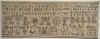 From the style of the sampler we know that is was made in the northern part of Friesland and that it's from around the 1700's as the entire sampler is stitched using long armed cross. The initials AL were probably those of her father. Typical of the Friesland samplers are all the household furnishings and tools used in the kitchen. The Kas with the key beside it was an important piece of furniture and was the woman's domain. She would have carried the key on a chain around her waist. The wonderful bands with birds were all bands that can be found on collars of the shirts they wore as well as on the cuffs and on household linens. The early Friesian samplers usually only had nineteen letters in the alphabet as I and J were interchangeable and the others just weren't used. Marking clothing and linens was very important that is why we generally see so many alphabets on a sampler. Linens were marked as they were sent out to the laundry and it would ensure you got the right ones back and clothing was marked as it helped identify bodies when people drowned. The bird at lower right is from Peter Quentel's pattern book and there is at least one other sampler that has the same bird with the initials DR, possibly a teacher.