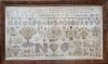 The long horizontal samplers originate out of the far north of Friesland. A very similar sampler to this one is picture in Letter voor Letter on page 72, no. 92. These are from Ameland, one of the islands of the north coast of the Friesland. Both feature the large pot with one tulip and roses or carnations. The large ship where all the crew have wigs on. The captain and his wife standing on an oriental carpet, the church and the pelican in it's piety. A beautiful tree of life has been stitched and the grape carriers are brown. The usual household implements have been stitched as well as a great spinning wheel. The schooner is towing a small ship which carries the souls of the departed.