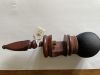 Hand made thread holder on top of a clamp. The top can be covered with embroidery which can be fastened to the round wooden part below it.