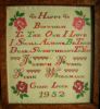 Susie's Hutterite handkerchief, was a birthday gift for her boyfriend, Joseph Stahl. Hutterite girls often stitched handkerchiefs for their boyfriends for various occassions. This is a very fine example of one and contains both cross-stitch and freehand embroidery on a store bought handkerchief. Conservation mounted and framed behind UV glass.